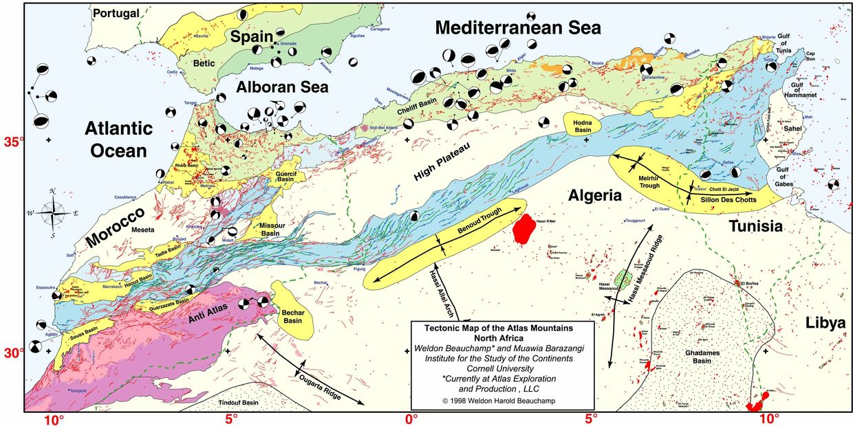 Atlas rift basin and the subsequent inverted/uplifted Atlas Mountains of North Africa.
